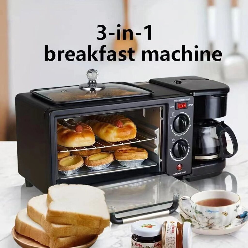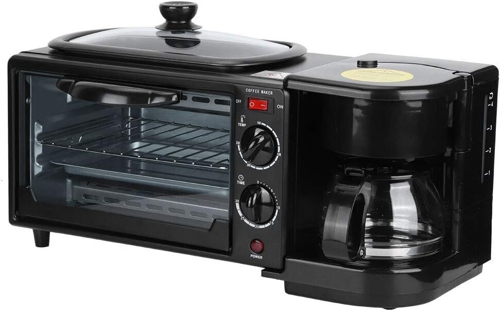 All-in-one breakfast solution: Start your day with our versatile breakfast station. This 3-in-1 appliance includes a 4-cup coffee maker, a large griddle for eggs, bacon, and pancakes, and a toaster that holds up to four slices of bread. Space-saving: Our compact breakfast maker is designed to save countertop space while providing a convenient solution for preparing your favorite breakfast dishes. Its stylish design makes it a great addition to any kitchen décor. Coffee Maker: This coffee maker brews up to 4 cups at a time in minutes, so you can enjoy a cup of coffee while your meal cooks. A glass carafe, coffee spoon, and reusable filter are included. Frying Pan: The nonstick frying pan offers ample space for frying eggs, omelets, pancakes, sausages, bacon, hash browns, and other breakfast dishes. It also comes with a glass lid. Specification: Item Type: Breakfast Machine. Material: Aluminum alloy. Color: Black. Frequency: 50Hz. Rated Power: 1050W. Oven Capacity: 9L. Coffee Cup Capacity: 4 Cups of Coffee. Temperature Range: 100-230℃. Product Size: 44 x 20 x 20cm/17.3 x 7.9 x 7.9in. Weight: 4100g/144.6oz.