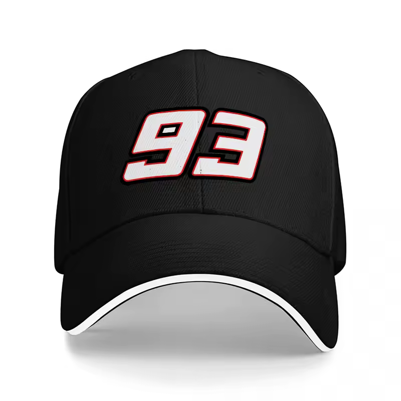 Baseball cap with number 93, black with white and red trim, classic snapback for men and women.